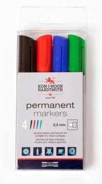 Permanentné značkovače plnené atramentmi na alkoholovej báze, odtieň červený, modrý, zelený, čierny.