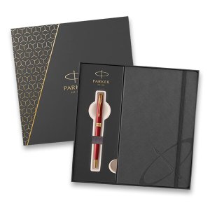 Darčeková sada s červenou perom a rollerom v darčekovej papierovej krabičke.