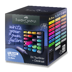 Stolová súprava 24 zvýrazňovačov Faber-Castell Textliner 46 v netradičných neónových 7x, pastelových 9x a metalických odtieňoch 8x.