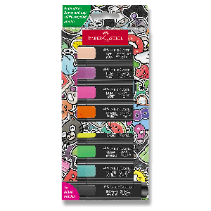 Súprava plochých zvýrazňovačov Faber-Castell Textliner 46 v 8 odtieňoch v modernom graffiti dizajne.