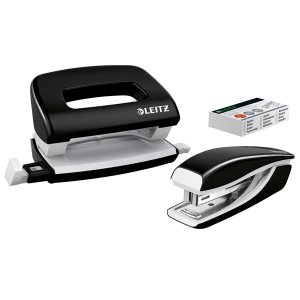 Súprava celokovovej mini zošívačky a dierovačky v metalických farbách Uzavreté zošívanie; horné plnenie drôtikov Súčasťou je štartovacie balenie drôtikov (1 000 ks) Príložník pre všetky štandardné formáty: A4, A5, …