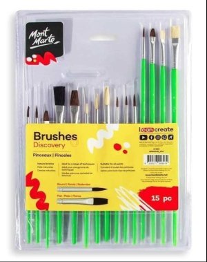 Súprava 15 štetcov rôznych tvarov a veľkostí z prírodných materiálov.