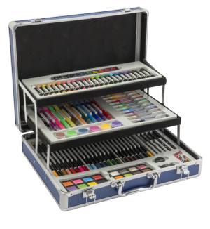 Kompletný kreatívny set pre malých aj veľkých umelcov! Obsahuje 140 kusov výtvarných potrieb – pastelky, fixky, voskovky, vodové farby, štetec, strúhadlo, gumu a ďalšie doplnky.