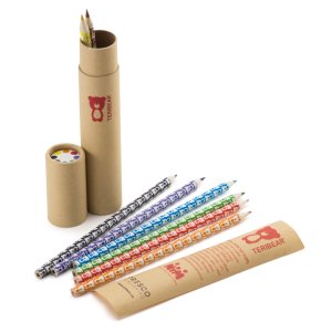 Sada 8 kusov orezaných pasteliek s potlačou medvedíka TERIBEAR v papierovom tubuse.