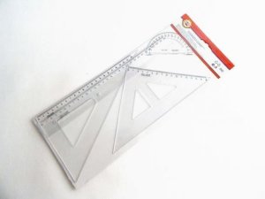 Súprava geometrická veľká sa skladá z výrobkov: trojuholník 45/177 s kolmicou, trojuholník 60/250, pravítko 30 cm a uhlomer 180/100.