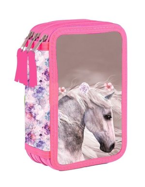 Školské púzdro je vybavené pevnými zipsami, uzatvárateľným vreckom na zips, priehradkou na pravítko a klopou so šiestimi pútkami na písacie potreby.