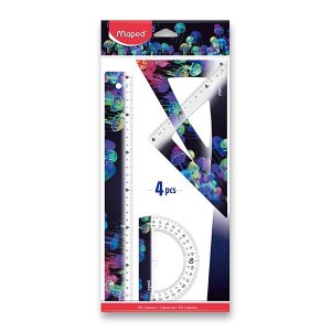 4dielna sada rysovacích potrieb obsahuje: pravítko 30 cm trojuholník 60°/21 cm trojuholník 45°/21 cm uhlomer 180°/12 cm