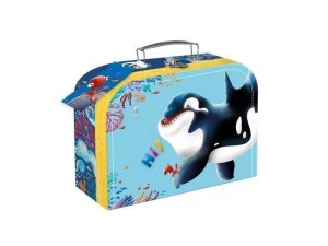 Papierový školský kufrík, šírka 25 cm, kovová rukoväť.
