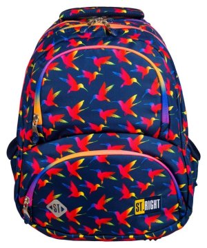 Štvorkomorový školský plecniak v modrej farbe s dúhovými zipsami a originálnym motívom Rainbow Birds!