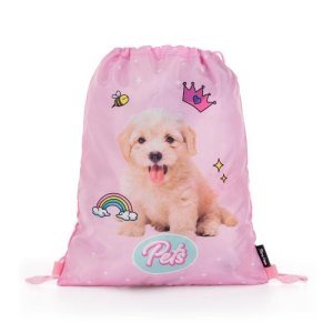 • Vrecko na cvičky alebo prezuvky z pevného umývateľného materiálu • Zdrhovanie pomocou pevných šnúrok, ktoré zároveň umožňujú nosenie na chrbte