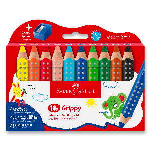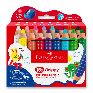 Sada kvalitních trojhranných pastelek Faber-Castell Grippy s patentovanou GRIP zónou v extra silném provedení s ořezávátkem.
