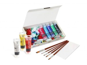 Sada obsahuje: 12 ks akrylových farieb v tube (12ml), 2 ks štetca - plochý a okrúhly, skicovací blok papierov na akryl A4