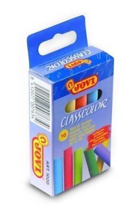 Súprava 12 kusov školských farebných štvorhranných kried s rozmermi 12x12x100 mm, ktoré sú určené na písanie na školské tabule, vložených do krabičky s potlačenou manžetou.