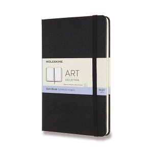 Zápisník vhodný na kresby, skice aj maľby, s pevnou, v chrbte šitou väzbou v kartónových doskách, obopnutý pružnou páskou proti samovoľnému otváraniu.