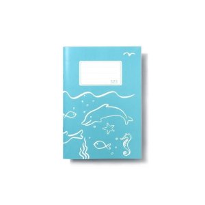 Školský linajkový zošit vo formáte A5, vo fialovej farbe, s motívom morskej korytnačky, v doskách z kriedového papiera.