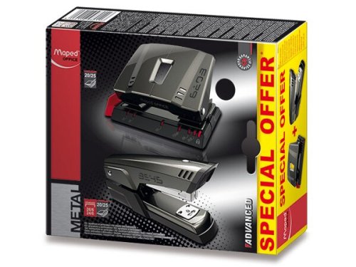 Celokovový dierovač Advenced Metal s prehľadne značeným posuvným príložníkom., * rýchle dierovanie pomocou indikátora rozstupu krúžkovej väzby, * rozstup medzi otvormi 8 cm, * ľahké vysypávanie zásobníka, * 5 rokov záruka, * na 20 listov papiera 80 g/m2 alebo na 25 zošívačka Advenced Half Strip s mechanizmom proti zablokovaniu drôtikov., * zásobník pre náhradné drôtiky v zadnej časti, * pohodlné plnenie zásobníka hĺbka vkladania papiera 52 mm, * drôtiky 24/6 na 20 listov, 26/6 na 25 listov, ,