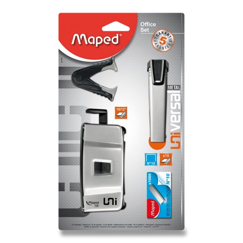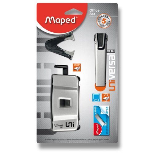 Zošívačka Universal Pocket No. 10, * hĺbka vkladania papiera 40 mm, * balenie obsahuje 400 ks drôtikov, * záruka 5 rokov, * drôtiky Maped No.10 na 15 listov, Dierovačka Universal, * rozstup medzi otvormi 8 cm, * záruka 5 rokov, * na 10 listov papiera 80 g/m2 Rozošívač,