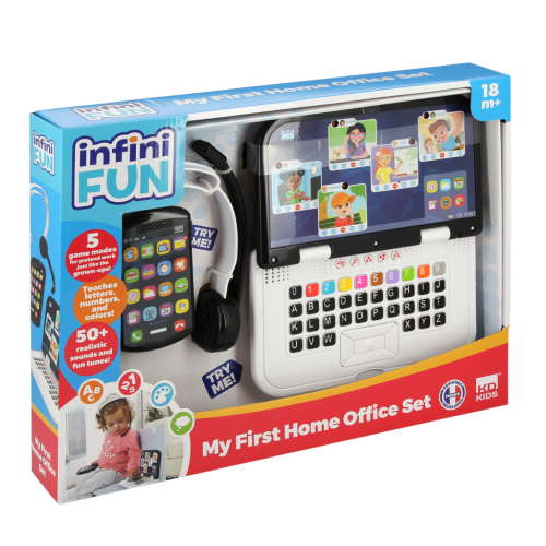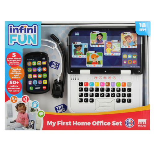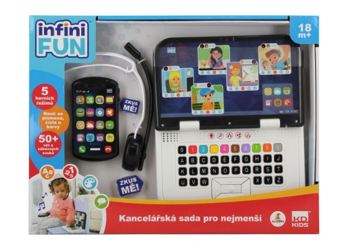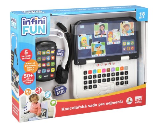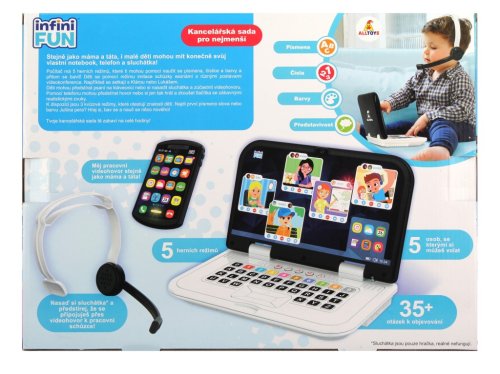 Prvý realistický set pre home office! Sada obsahuje detský počítač, slúchadlá a telefón. Počítač obsahuje 5 herných režimov – objavovanie, písmená, čísla, farby a hru „buď ako“ Počítač má zvukový režim v CZ/SK verzii, telefón má zvukové efekty a hrá hudbu; slúchadlá sú bez elektronickej funkcie.