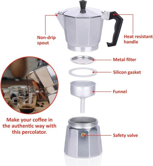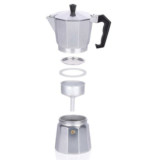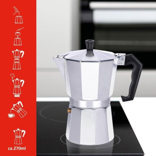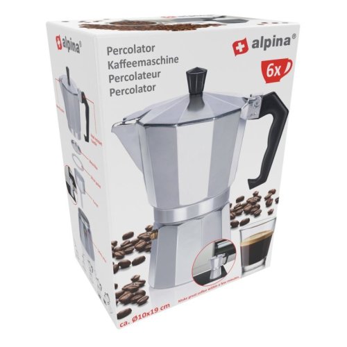 Kanvička na espresso na 6 šálokPrebuďte sa s vôňou čerstvo uvarenej kávy s kanvičkou Alpina na espresso! S kapacitou až 6 šálok kávy na jeden spar je ideálny ako pre rýchlu rannú šálku, tak pre ponúkanie kávy vašim hosťom. Odnímateľné časti uľahčujú čistenie a doplňovanie vašej obľúbenej kávy, zatiaľ čo rýchla príprava vám poskytne lahodnú kávu v priebehu niekoľkých minút. Vďaka flexibilnému a prenosnému dizajnu si môžete vziať kanvicu na espresso všade so sebou, do kancelárie alebo na výlet. Špecifikácia :- Objem: 270 ml- Veľkosť: cca. 10 x 19 cm (O x V) - Hmotnosť: cca. 320 g