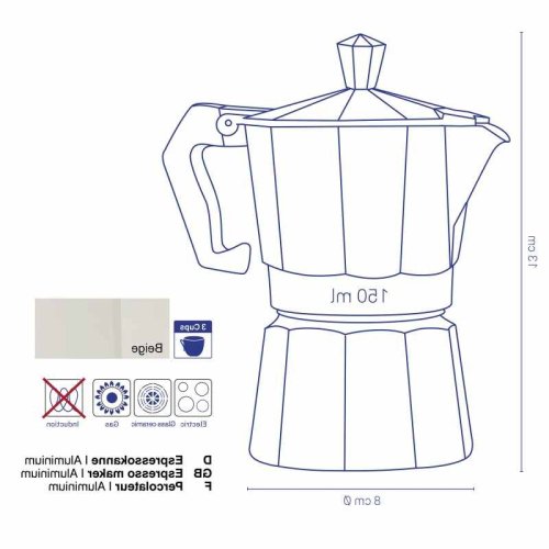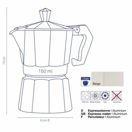 Klasika medzi kávovarmi: kanvička na espresso ITALIA vyrobená z hliníka v béžovej farbe. Príprava espressa nemôže byť jednoduchšia: nalejte vodu a kávu do kanvice na espresso ITALIA, položte na sporák a za chvíľu je espresso hotové: so správnou arómou kávy, horúce a lahodné. Na 3 šálky (150 ml). Vhodné na elektrický sporák, sklokeramickú dosku, plynový sporák, sálavé.Hliník 8cm, 13cm v na 3 šálky