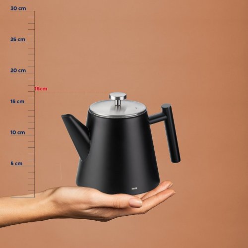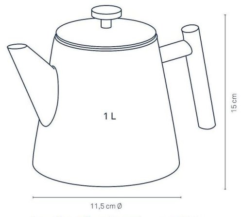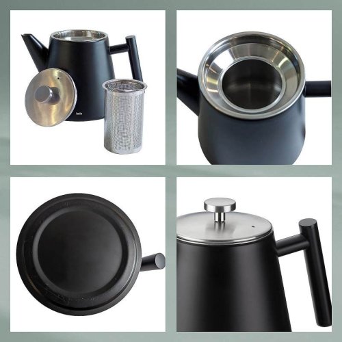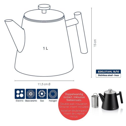 Servírovacia kanvica Modena- odnímateľné nerezové sitko pre sypané čaje- nerezová pokrievka- nerezová oceľ 18/10- nemožno použiť na sporáku- farba: matná čierna- rozmery: 11,5 cm x 15 cm- objem: 1L