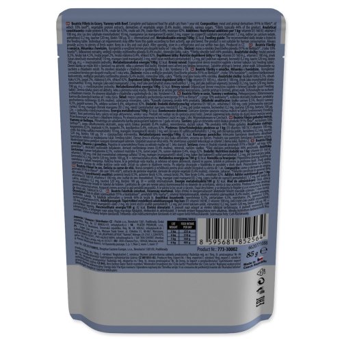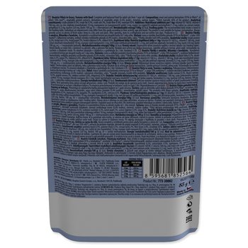 | Zloženie: | Mäso a výrobky živočíšneho pôvodu (91 % vo filetkách*, z toho 10 % hovädzie*), bielkovinové extrakty, vedľajšie výrobky rastlinného pôvodu (0,4 % inulín), minerálne látky, cukry. *Filetky obvykle tvoria 44 % produktu. |