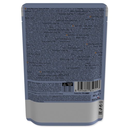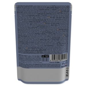 | Zloženie: | Mäso a výrobky živočíšneho pôvodu (91% vo filetkách*, z toho 10% kuracie*), bielkovinové extrakty, vedľajšie výrobky rastlinného pôvodu (0,4% inulín), minerálne látky, cukry. *Filetky obvykle tvoria 44% produktu. |