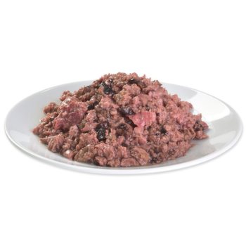 Zloženie: 85% mäso a vedľajšie výrobky živočíšneho pôvodu vo filetoch (8% jahňa), 9,6% mäsová šťava, 1,5% byliny a ovocia (klinčeky, citrusy, rozmarín, kurkuma), 0,5% čučoriedky, 1% minerály, 1% lososový olej, 0,5% mannán-oligosacharidy, 0,5% frukto-oligosacharidy, 0,4% inulín. Analytické zložky: hrubý proteín 9 %, hrubé oleje a tuky 4 %, hrubý popol 2,2 %, hrubá vláknina 0,4 %, vlhkosť 82 %, vápnik 0,3 %, fosfor 0,2 %, sodík 0,5 % . Nutričné doplnkové látky na 1 kg: vitamín D 3 (E671) 250 oi , vitamín E (3a700) 100 mg, zinok (3b606) 15 mg, železo (3b103) 10 mg, mangán (3b502) 3 mg, jód 0,75 mg, meď (E4) 0,5 mg, biotín (3a880) 0,2 mg. Bez umelých aróm. Bez konzervantov. Metabolizovateľná energia: 815 kcal/kg Kŕmny návod:
