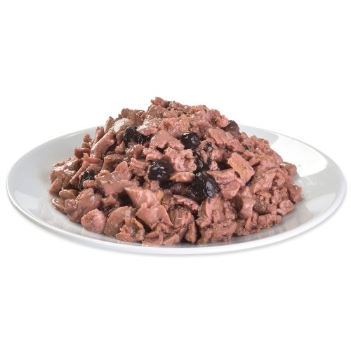 Zloženie: 45 % ryby a výrobky rybieho pôvodu vo filetoch (4 % losos, 4 % sleď), 9,6 % mäsová šťava, 1,5 % byliny a ovocie (klinčeky, citrusy, rozmarín, kurkuma), 0,5 % čučoriedky , 1% minerály, 1% lososový olej, 0,5% mannán-oligosacharidy, 0,5% frukto-oligosacharidy, 0,4% inulín. Analytické zložky: hrubý proteín 8 %, hrubé oleje a tuky 4 %, hrubý popol 2 %, hrubá vláknina 0,4 %, vlhkosť 82 %, vápnik 0,3 %, fosfor 0,2 %, sodík 0,5 %. Nutričné doplnkové látky na 1 kg: vitamín D 3 (E671) 250 oi , vitamín E (3a700) 100 mg, zinok (3b606) 15 mg, železo (3b103) 10 mg, mangán (3b502) 3 mg, jód 0,75 mg, meď (E4) 0,5 mg, biotín (3a880) 0,2 mg. Bez umelých aróm. Bez konzervantov. Metabolizovateľná energia: 820 kcal/kg Kŕmny návod: