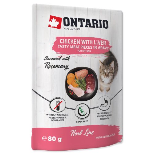 Doplnkové krmivo pre mačiatka od 1 mesiaca – lahodné kúsky kuracieho mäsa s pečeňou a sladkými zemiakmi v chutnej omáčke. Špeciálne ochutené rozmarínom.