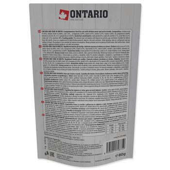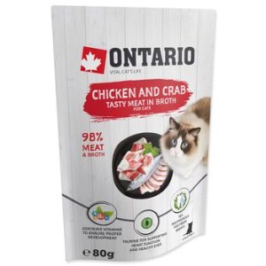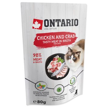 Zloženie: mäso a výrobky živočíšneho pôvodu, ryby a výrobky z rýb 56,09% (kuracie mäso 47,92%, krab 7,8%, ryba bonito 0,37%), kurací vývar 42,468%, karagenan 0,94%, škrob 0,41%, taurín 0,08%, extrakt z čaju 0,008%, vitamíny (A, B2, B3, B5, D3, E, polydextróza) 0,004%.