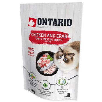Doplnkové krmivo pre mačky s kuracím mäsom a krabom vo vývare .