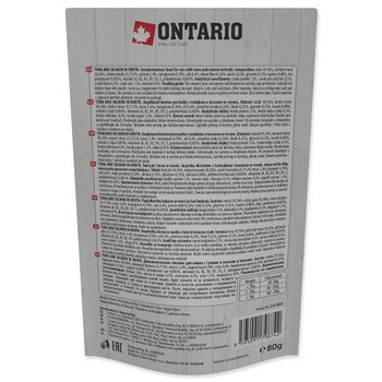 Mäso a výrobky živočíšneho pôvodu, ryby a výrobky z rýb 72,44% (tuniak 39,76%, kuracie mäso 30,28%, losos 2,4%), kurací vývar 25,712%, karagenan 0,78%, soľ 0, 4%, pšeničná múka 0,24%, škrob 0,22%, glycerín 0,12%, taurín 0,08%, extrakt z čaju 0,005%, vitamíny (A, B2, B3, B5, D3, E, polydextróza) 0,003%.