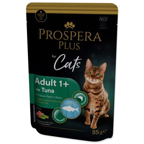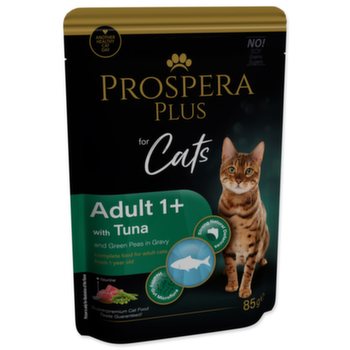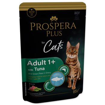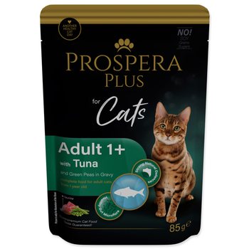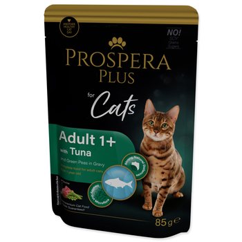 Kompletné krmivo pre mačky od 1 roku v podobe kapsičky s tuniakom a hráškom.