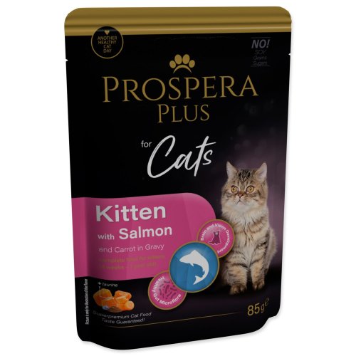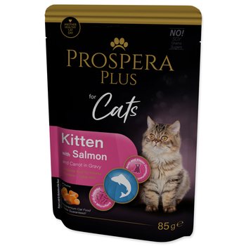 Kompletné krmivo pre mačiatka vo veku od 4 týždňov do 1 roka v podobe kapsičky s lososom a mrkvou v omáčke.