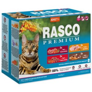 Zloženie: Mäso a výrobky živočíšneho pôvodu (88%* vo filetkách, z toho 40,6% kačacie, 27% bravčová pečeň, 14,5% bravčové, 4,8% hovädzie, 1,1% hydina) 1,8% minerály, oleje a tuky (0,5% ľanový olej), vedľajšie výrobky rastlinného pôvodu (0,6% škrob, 0,4% inulín, 0,2% vláknina), rakytník 0,05%. * Filetky typicky 34,5% výrobku.