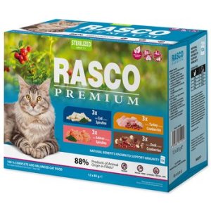 Zloženie: Mäso a výrobky živočíšneho pôvodu (73,5% * v kúskoch, z toho 27% bravčová pečeň, 14% bravčové, 8,5% hydinová, 20% kuracie, 4% hovädzie), ryby a vedľajšie výrobky z rýb (14 ,5% treska*), 1,8% minerály, vedľajšie výrobky rastlinného pôvodu (0,6% škrob, 0,4% inulín, 0,2% vláknina), 0,05% spirulina. * Filetky typicky 34,5% výrobku.