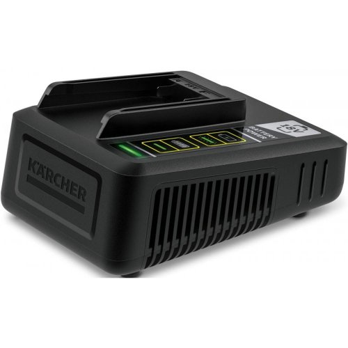 Duálna rýchlonabíjačka dokáže nabíjať 2 batérie súčasne vďaka 2 slotom. Je možné ho ľahko pripevniť na stenu pomocou vstavaného nástenného držiaka. Rýchlonabíjačka nabije výmenné batérie Kärcher Battery Power 18 V/2,5 Ah na 80 % iba za 44 minút. Je možné ho tiež použiť na dobíjanie všetkých ostatných 18V výmenných batérií na 18V batériovej platforme Kärcher