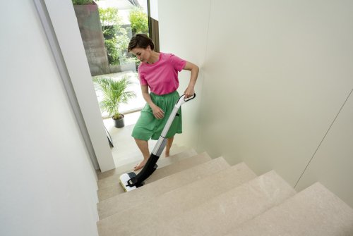 S podlahovou umývačkou FC 4-4 už nemusíte pred vytieraním vysávať a môžete odstrániť suché aj mokré každodenné nečistoty v jednom kroku. Dodávaná rýchlonabíjačka Duo umožňuje nabíjanie iba za 70 minút. oznámenie, kedy je potrebné doplniť nádrž na čerstvú vodu a vyprázdniť nádrž na špinavú vodu Pri spustení sa oba valce automaticky navlhčia vodou z nádrže na čerstvú vodu Množstvo vody je možné prispôsobiť povrchu podlahy pomocou dvoch režimov čistenia aj ťažko prístupná. miesta a ľahko zachytáva vlasy. Priamemu kontaktu so špinou zabraňuje integrovaná a hygienická nádrž na špinavú vodu, ktorú je možné po použití prístroje vybrať a vyčistiť. FC 4-4 stojí samostatne a vďaka odnímateľnej rukoväti je možné priestorovo úsporne skladovať.