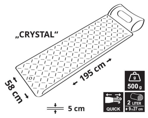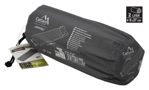 Chystáte sa stanovať? Nezabudnite so sebou pribaliť karimatku a pripravte si pohodlné miesto na spanie. Nafukovacia karimatka Cattara CRYSTAL s vankúšikom vám poskytne komfort nielen pri odpočinku v prírode. Pri nafukovaní membrána zadrží vzduch vo vnútri karimatky, čo uľahčuje jej prípravu. Nafúknutá karimatka má rozmery 195 x 58 x 5 cm.