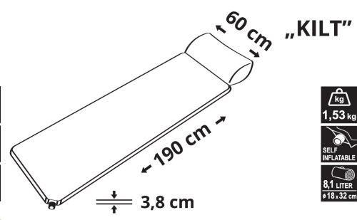Pri skladaní samonafukovacej karimatky sa najskôr uvoľní ventil a tlakom sa vzduch vyháňa von, takže má rozmery batožinu a lepšie sa prenáša . Táto karimatka sa skvele hodí pre spacie vaky typu múmie , ktoré sú najrozšírenejšie najmä kvôli svojej zbaliteľnosti, ale tiež sa dá využiť aj v spojení s dekovými či oválnymi typmi . Vďaka svojej dĺžke 190 cm a šírke 60 cm je karimatka ideálna aj pre väčšie osoby . Farba karimatky je prevažne červená so vzorom tartanových kociek - kilt . Karimatka je navyše vybavená vankúšom pre väčšie pohodlie v akýchkoľvek podmienkach. Pomocou cvočkov je možné karimatku spojiť s ďalšou karimatkou, čo ocenia najmä zamilované páry alebo rodičia s malými deťmi.