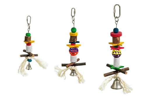 Farebná drevená hojdacia hračka pre vtáky so zvončekom z prírodných materiálov.