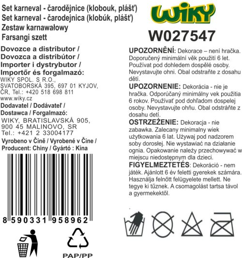Karnevalový set - čarodejnica Obsahuje: klobúk, plášť Dĺžka plášťa: 72 cm