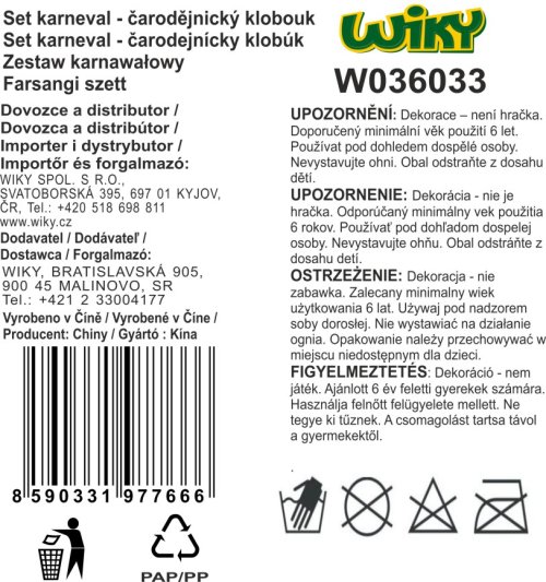 Set karneval - čarodejnícky klobúk o veľkosti 38x33 cm. Dve farebné prevedenia.