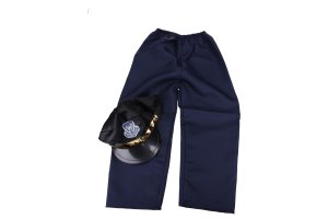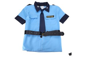 Set karneval policajt. Pre deti o veľkosti 110-120 cm. Súčasti kostýmu: čiapka, košeľa, kravata, opasok, nohavice.