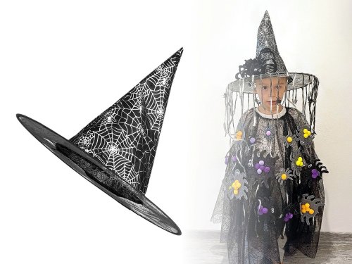 Karnevalový klobúk vás premení na čarodejníka alebo čarodejnicu. Dobre drží tvar, je z nepriehľadnej polyesterovej tkaniny. Hore na prednej strane má potlač. Môžete si ho dozdobiť podľa vlastného vkusu a fantázie. Šírka krempy je 9 cm. Klobúk č.1 má metalickú potlač pavučín na celej ploche klobúka, krempu má priesvitnú.