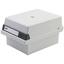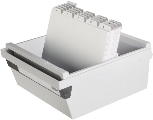 Kartotéka vyrobená z pevného plastu s gumovými nožičkami a odnímateľným vekom Formát A5 na šírku Rozmer 235 x 190 x 250 mm 1 deliaca doska Kapacita: pre 800 kariet