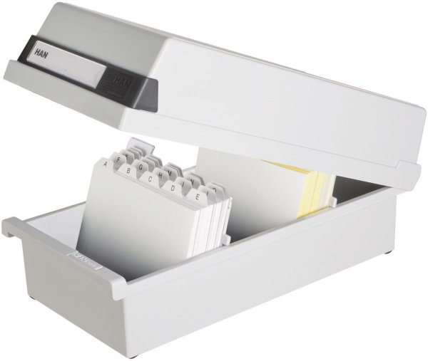 Kartotéka vyrobená z pevného plastu s gumovými nožičkami a odnímateľným vekom Formát A6 na šírku Rozmer 177 x 140 x 360 mm Popis 2 deliace dosky, celkom pre 1 300 kariet