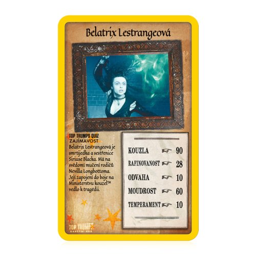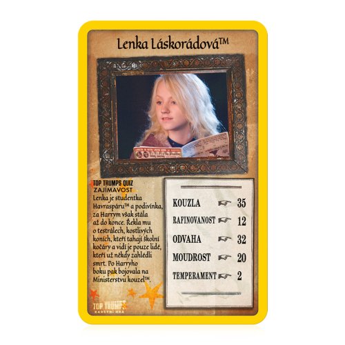 Perfektná kartová hra pre každého fanúšika Harryho Pottera. Otestujte si, ako dobre poznáte filmové postavy. Alebo sa o nich možno dozviete niečo nové? Hru môže hrať ľubovoľný počet ľudí, ale nie menej ako dvaja. Top Trumps má mnoho verzií a je často kombinovaný s populárnymi licenciami. Táto edícia obsahuje postavy z filmu Harry Potter a Fénixov rád. Harry, Ron a Hermiona začínajú piaty rok v Rokforte a čelia svojej najdrsnejšej učiteľke, profesorke Umbridgeovej. Dozvedia sa aj o obrannej lige založenej na boj s Voldemortom - Fénixov rád. Kto sa ukáže ako najstatočnejší? Kto predvedie viac mazanosti – Bellatrix Lestrangeová alebo Lucius Malfoy? Ak to chcete zistiť, hrajte Top Trumps Harry Potter a Fénixov poriadok. V balíčku nájdete aj Smrťožrútov. Zamiešajte balíček kariet a rozdajte ich všetkým hráčom, ktorí ich potom musia držať lícom hore. Vezmite prvú kartu z hornej časti balíčka, otočte ju a vyberte si jeden z atribútov. Zvyšok hráčov tiež otočí prvú kartu zo svojich kôpok a uvedie im hodnoty priradené k atribútu, ktorý ste si na začiatku vybrali. Pokiaľ máte najvyšší počet bodov, vyhráte svoj ťah a vezmete karty svojich súperov tak, že ich umiestnite na koniec svojej kôpky. Stávate sa víťazom, ak získate všetky karty svojich súperov! 33 kariet v plastovej krabičke.