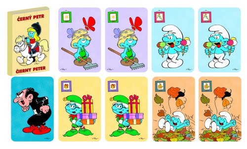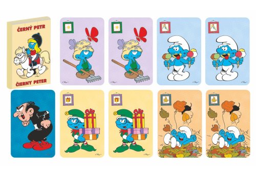 Detské karty pre hru zvanú Čierny Peter s obrázkami Šmolkovia. Krabička obsahuje aj podrobný návod a karty majú na rubovej strane mierne zdrsnený povrch pre lepšiu manipuláciu s nimi.